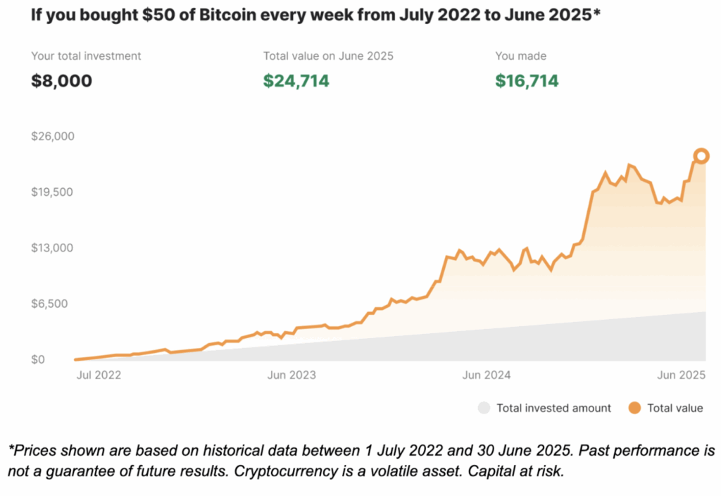 Choose a dollar amount and schedule (e.g. $5 of Bitcoin weekly), and your crypto is purchased without you lifting a finger.
